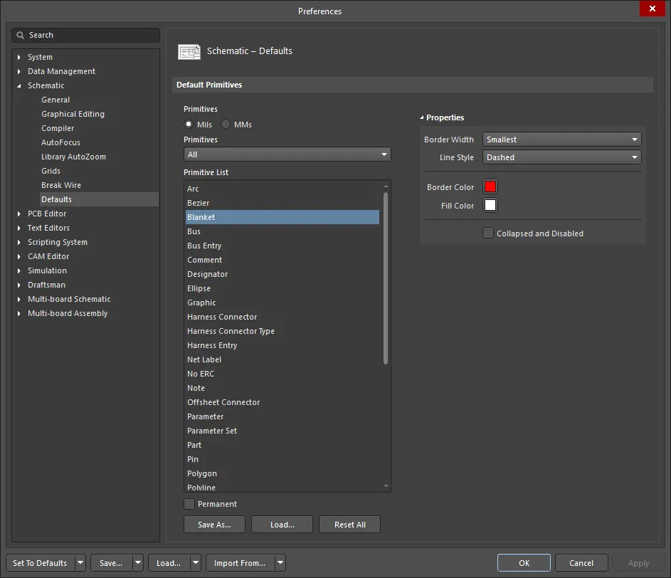 تنظیمات پیش‌فرض مربوط به ویژگی‌های تمامی اشیای شماتیکی، از جمله